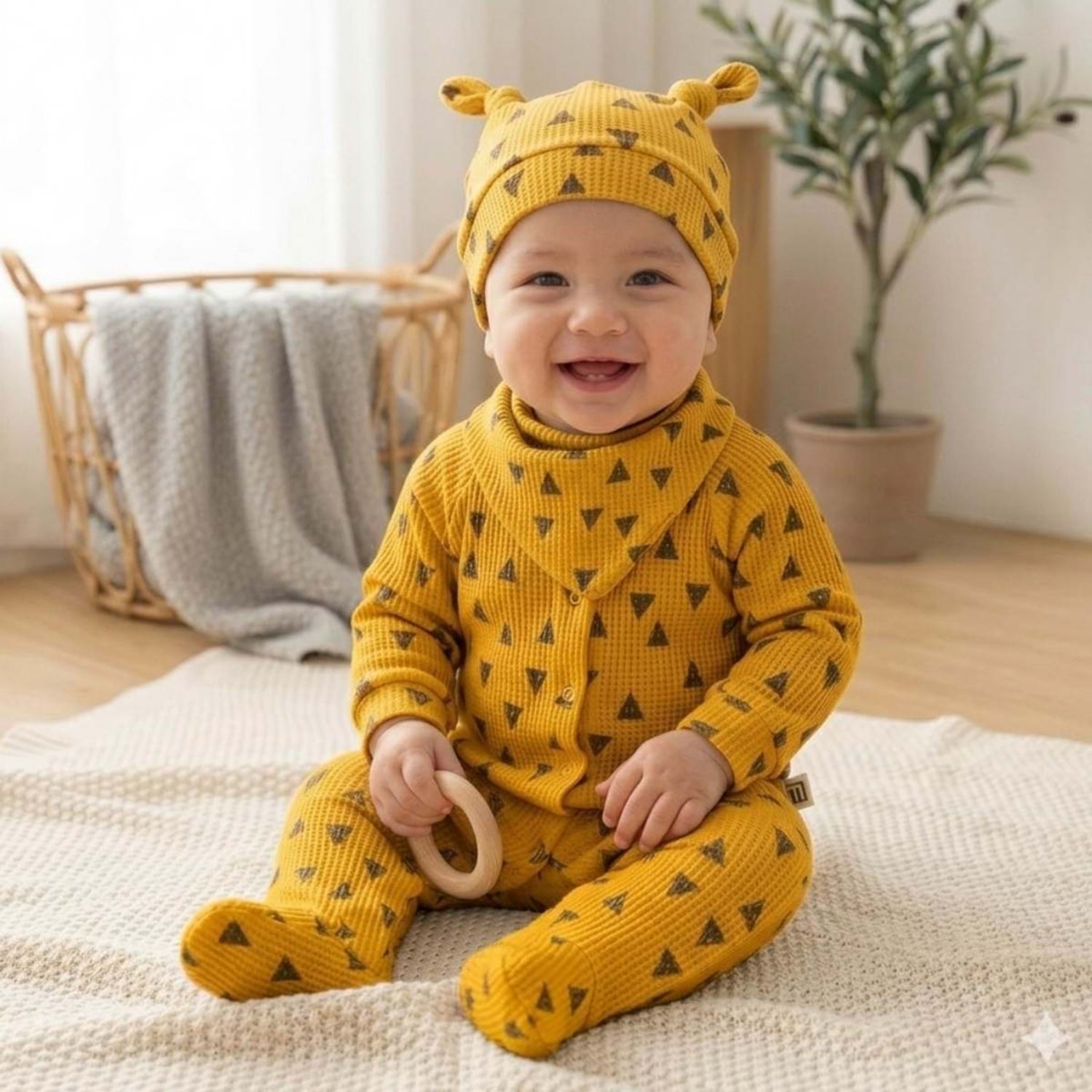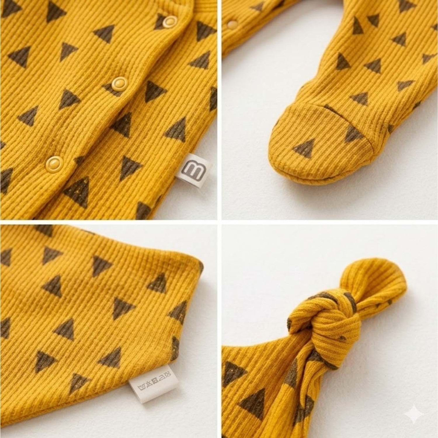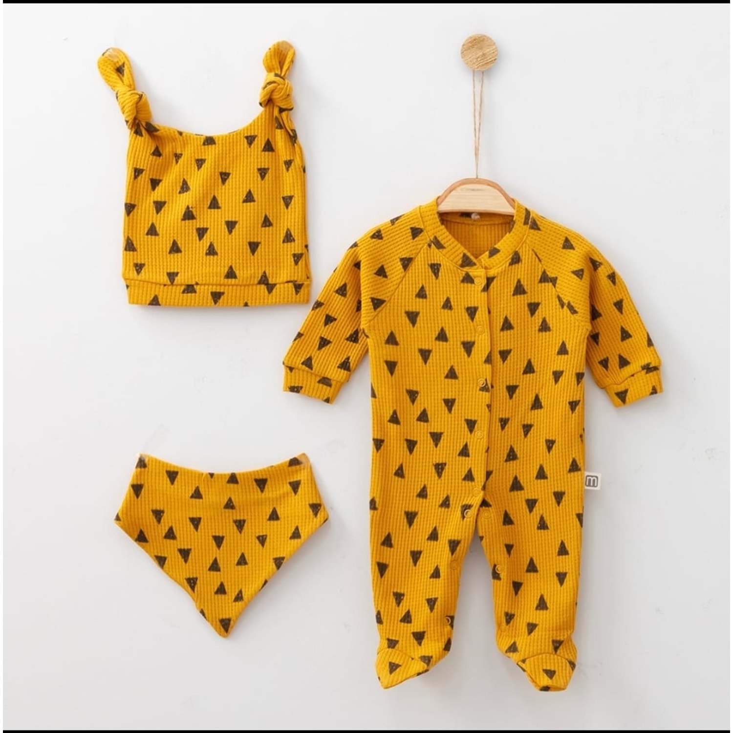 Üçgen Desenli Fitilli Pamuk Kumaş Patikli Bebek Tulum Seti - Hardal - 0-3 AY