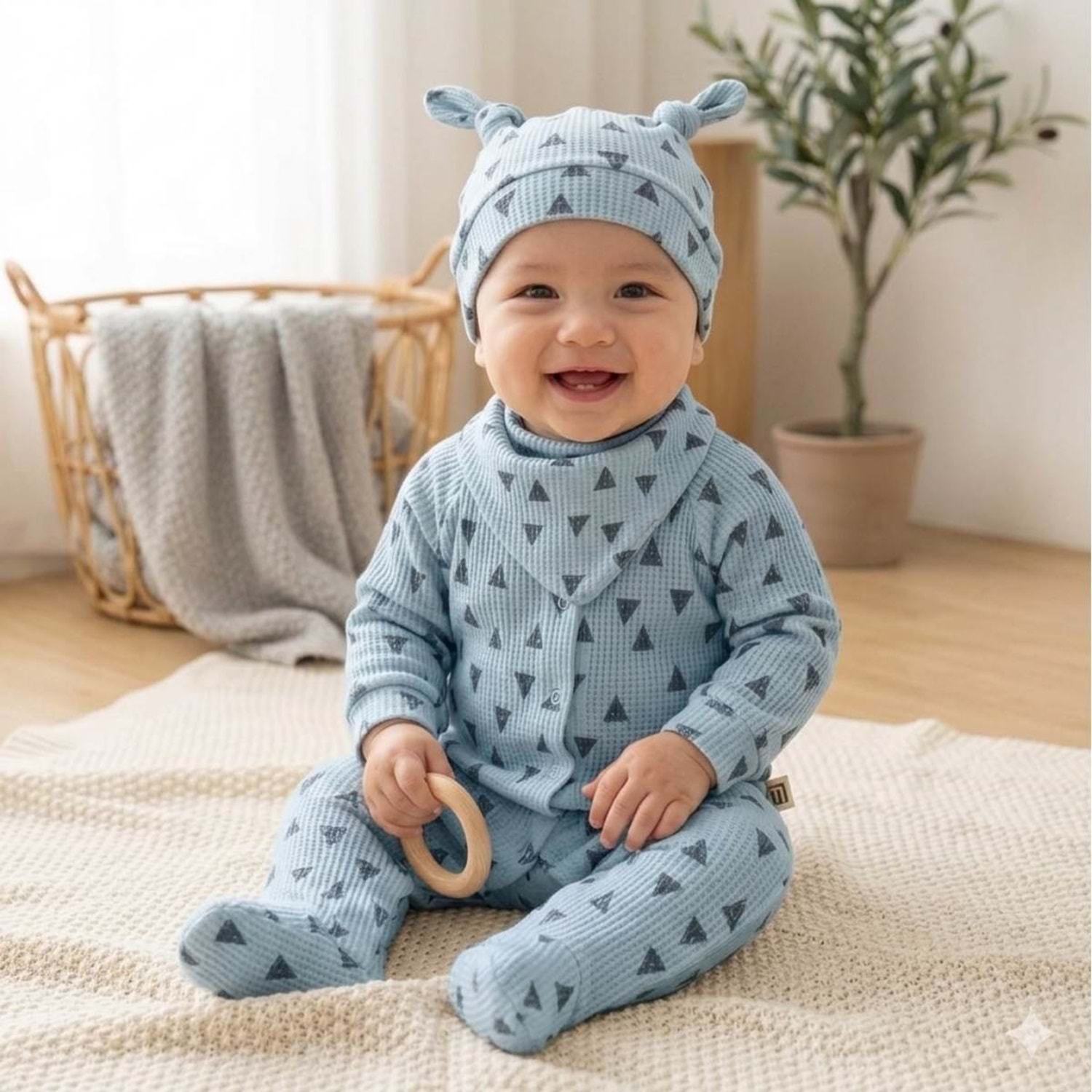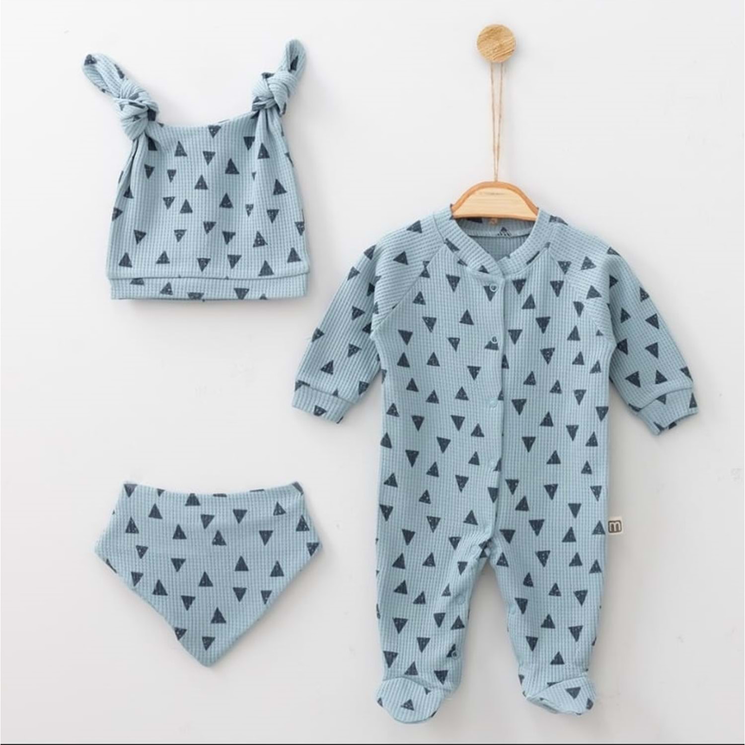 Üçgen Desenli Fitilli Pamuk Kumaş Patikli Bebek Tulum Seti - Mavi - 3-6 AY